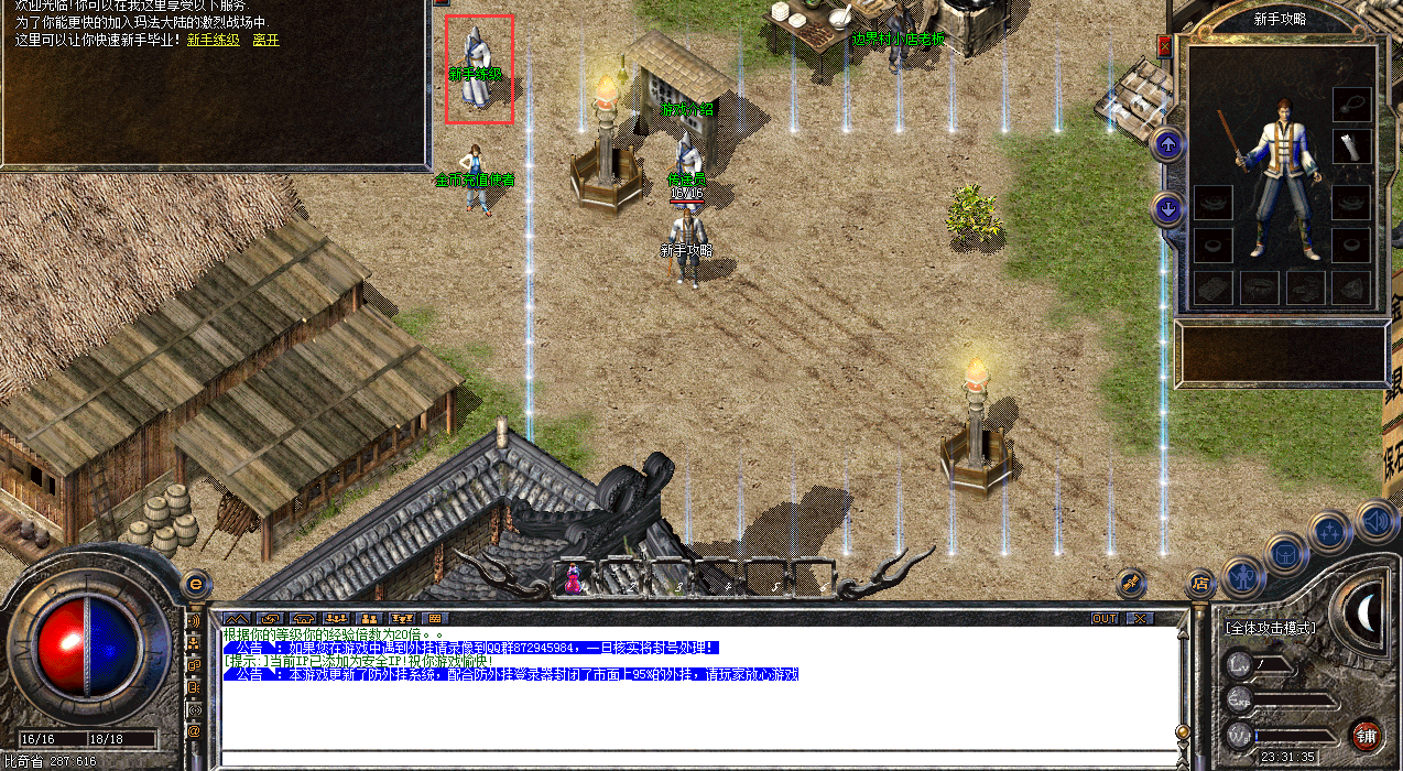 设置完成之后,点击npc,会将玩家传送至新手村,在新手村安全区外,有一个名叫新手练级的NPC,点击进入,能快速升级