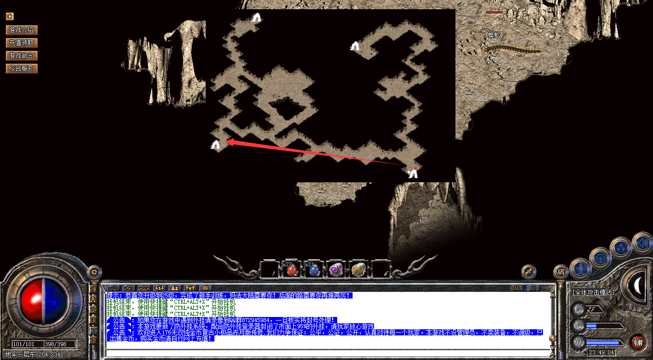 玩家可以去蜈蚣洞,新手圣地,封魔矿区等系列地图击杀怪物获取装备卖给商店,赚取一定数量的金币,当金币达到一定数额,玩家可前往高级地图获取更高级别的装备