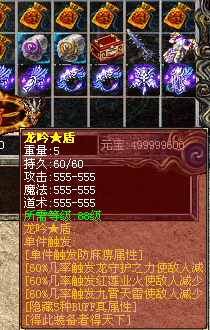 更新介绍② >>更新一个终极盾牌,龙吟★盾,在原来盾的基础上增加了逆天的50%几率各种BUFF!